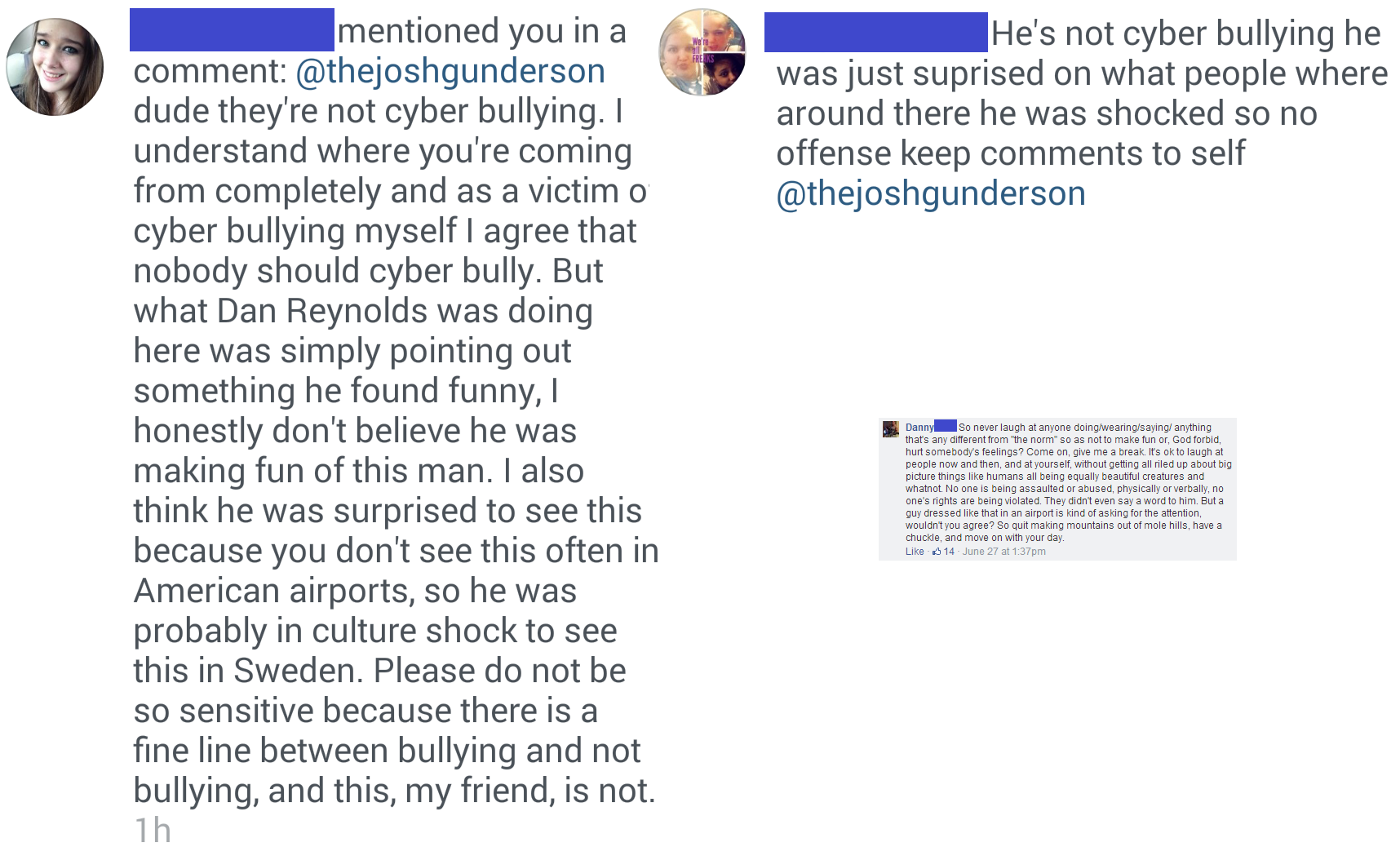 ” Dear Imagine Dragons, I am going to kindly request that you remove this video from this and any other feeds. Whether you realize it or not, this is a form of cyberbullying and sending the wrong message to your 9 million plus followers here on Facebook. I know for a fact that many young people look up to you as role models and inspirations and by posting a video like this and laughing at someone who is different, you are delivering the idea that doing something like this is not only okay, but funny. I am a big fan of yours, with your CD playing almost non-stop in my car and seeing something like this on your feed is greatly disappointing. Please consider the impact that you have on the beliefs and values of your fans before posting photos and videos such as this. Imagine this person is a fan of yours and sees himself on your Facebook feed being made fun of. How do you think that would make him feel? How would it feel if someone did this to you. You have the unique opportunity to make a difference in the lives of many and that is not something that should be taken lightly. Thank you.”